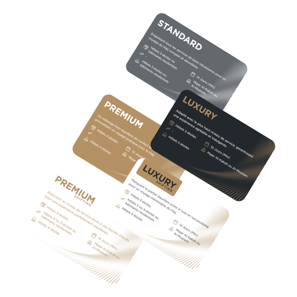 Les offres de pèlerinage se caractérisent par la diversité des services inclus. Dans l’objectif de rendre plus accessible le processus de sélection pour les futurs pèlerins, une typologie de forfaits uniformisée a été développée. Cette approche permet de présenter un éventail d’options qui s’ajustent aux besoins particuliers et aux moyens financiers de chaque pèlerin.